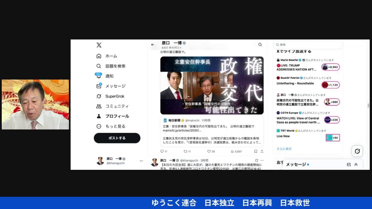 原口一博さん(2025年10月10日):政権交代の可能性出てきた。公明党の連立離脱で立憲安住幹事長。