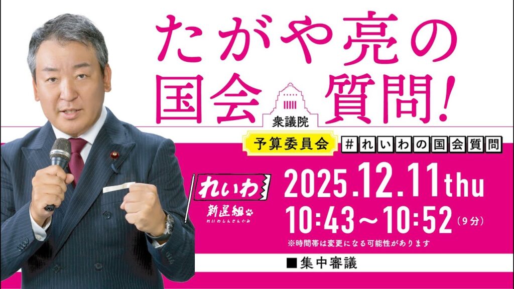 山本太郎さん: 【LIVE!】衆議院 予算委員会 たがや亮の国会質問!(2025年12月11日 10時43分~)