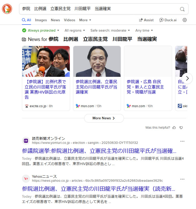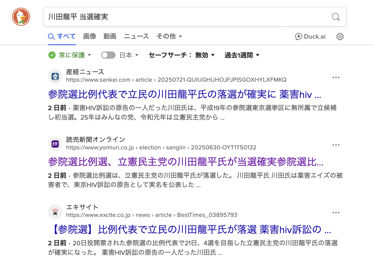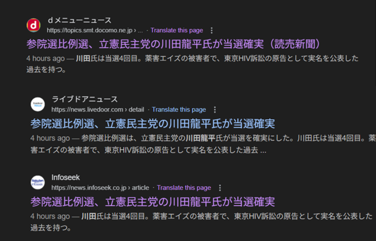 当確報道があった形跡を、筆者は22日に知った。ウェブ上に20日当日の検索結果の画面が幾つも保存されている【検索画面1、2】。22日に筆者が検索した際も、【検索画面3】中段のように「参院選比例選、立憲民主党の川田龍平氏が当選確実参院選比…」の見出しだけ残っていた。