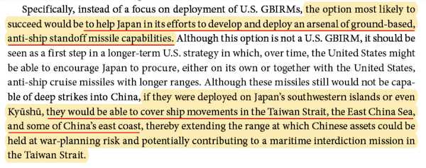 アメリカ国防総省系のシンクタンク「RANDコーポレーション」が2022年4月に発表した報告書によると、GBIRM(地上配備中距離弾道ミサイル)で中国を包囲する計画を彼らは持っている。日本は国防総省の計画に基づき、GBIRM(地上配備中距離弾道ミサイル)で中国を包囲する計画を進め、自衛隊は2016年に与那国島でミサイル発射施設を建設、19年には奄美大島と宮古島、そして23年には石垣島でも施設を完成させた。