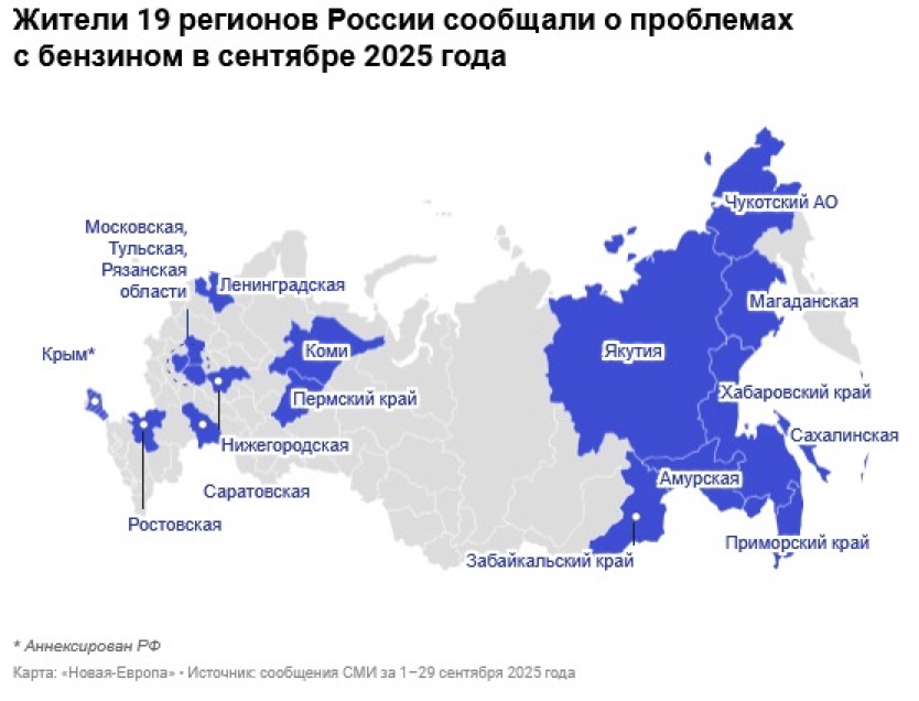 この結果、下の地図に示した、少なくとも18の地域と併合されたクリミアの計19地域でガソリン問題が報告されているという。