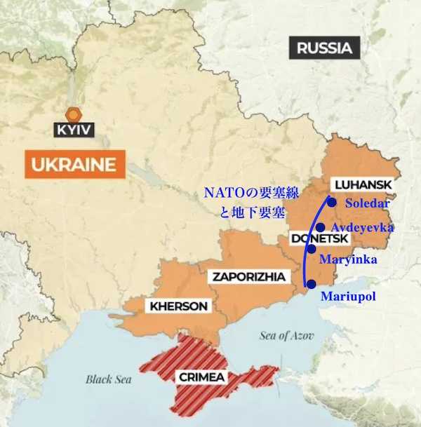 NATO側は8年かけ、兵器の供与や兵士を育成するだけでなく、マリウポリ、マリーインカ、アブディフカ、ソレダルの地下要塞を結ぶ要塞線をドンバスに築いている。ウクライナの軍や親衛隊はドンバスへ軍事侵攻して住民を虐殺、ロシア軍を誘い出して要塞線の内側に封じ込め、その間に別働隊でクリミアを攻撃するという計画だったのではないかと元CIA分析官のラリー・ジョンソンは推測している。