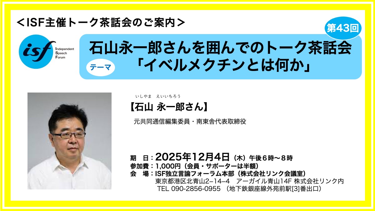 ISF主催トーク茶話会:石山永一郎さんを囲んでのトーク茶話会 12/4のご案内