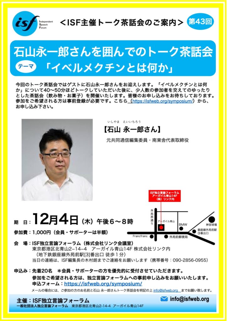 ISF主催トーク茶話会:石山永一郎さんを囲んでのトーク茶話会 12/4のご案内