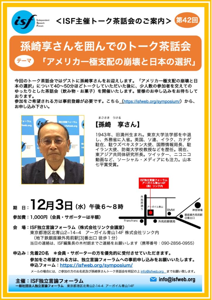 ISF主催トーク茶話会:孫崎享さんを囲んでのトーク茶話会 12/3のご案内