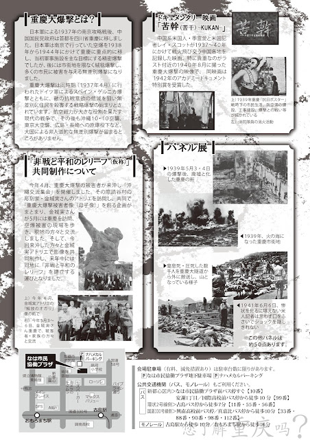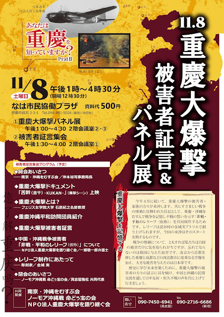11月8日(土)は午後1時から4時半、なは市民協働プラザで「重慶大爆撃 被害者証言&パネル展」、重慶爆撃ドキュメント(爆撃シーン)上映など。
