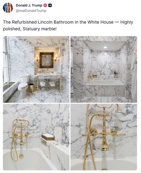 トランプ大統領のTruthSocialへの投稿:改装されたリンカーン寝室の浴室の内部