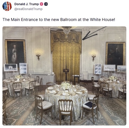 ただし、9日午後、トランプは週末をゴルフに費やした後、フットボール観戦のためワシントンに戻る飛行機のなかで、再び全神経を注ぐプロジェクトに意識を向けていた。その結果、「ホワイトハウス新舞踏場のメインエントランス!」と投稿し、改装中の空間の進捗写真(下の写真)を添えた。どうやら、本人は相変わらずaffordabilityについてほとんど何も考えていないように現時点では思われる。