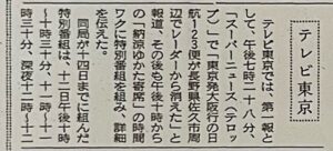≪テレビ東京では、第一報として、午後七時二十八分、「スーパーニュース(テロップ)」で「東京発大阪行の日航123便が長野県佐久市周辺でレーダーから消えた」と報道、その後も午後十時からの「納涼ゆかた寄席」の時間ワクに特別番組を組み、詳細を伝えた。≫