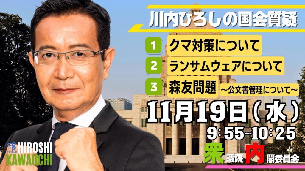 【ヒロシの国会質疑】(2025年11月19日):クマ対策〜箱わなの設置と自衛隊の協力〜/森友文書問題〜公文書管理〜/ランサムウェア対策(2025年11月19日衆議院内閣委員会)